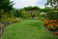 Naklejka Kwiaty - piękny ogród, zielony trawnik w ogrodzie otoczony krzewami ozodbnymi i kolorowymi kwiatami,... #1373116502