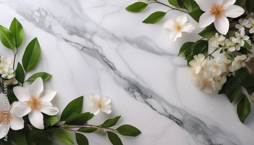 Naklejka Kwiaty - wiosenne kwiaty i li cie na marmurowym tle uchwycone w wyj tkowej fotografii o eleganckim stylu #1378245895