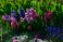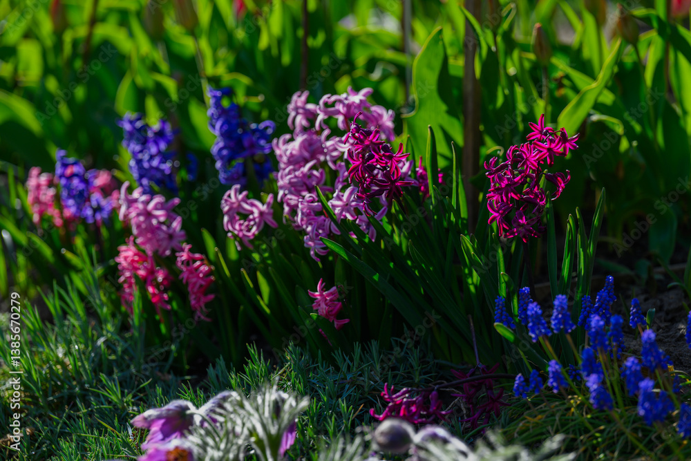 • Kolorowe wiosenne kwiaty w ogrodzie w promieniach słońca