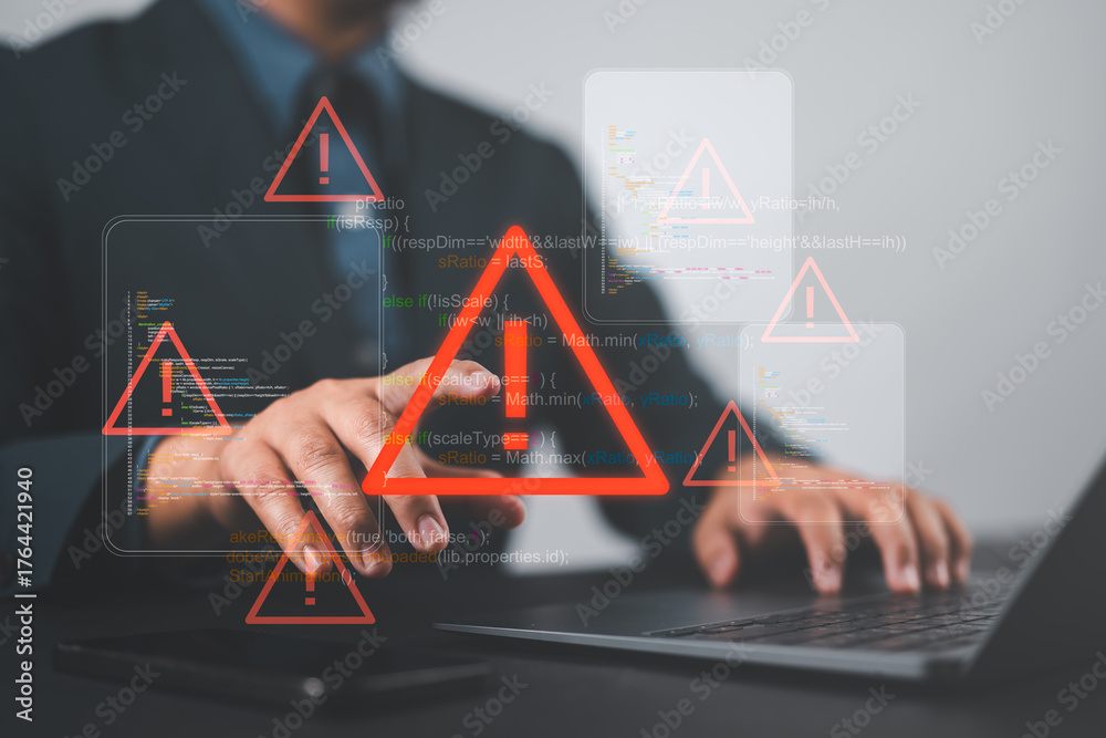 • Ransomware malware attack and data breach. Businessperson using laptop with spam virus on warning caution for notification on internet security protect.