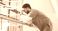 Young woman hanging blank frame on beige wall at home, back view Dopasuj i kup Naklejka