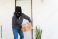 • Thief in a black mask swiftly snatching a brown parcel from a doorstep, pilfering a delivered package from a residence
