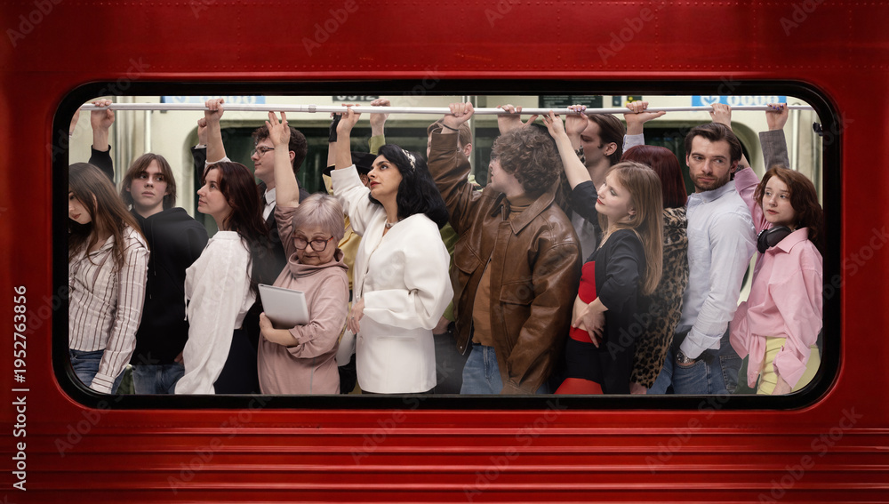 • Diverse passengers standing inside subway train holding rail in red carriage in urban setting. Concept of daily commute, city lifestyle, public transport and social diversity.
