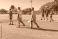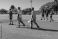 • Male teammates in shorts and shirts walking across pitch at park carrying cricket bats and pads