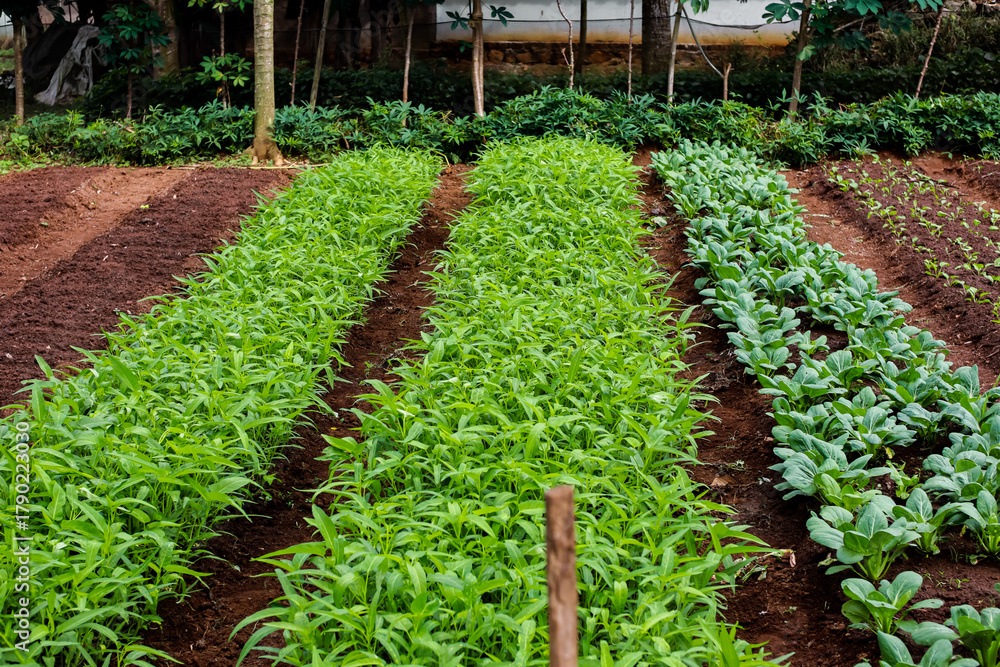 Naklejka do Kuchni - Lush organic vegetable garden featuring various crops in neat rows outdoors #1790223030