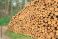 • Pnie ściętego sosnowego drzewa ułożone w sągi przy leśnej drodze.