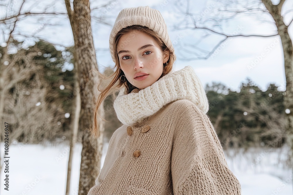 • A Young Woman Poses Elegantly in Winter Fashion, Surrounded by a Snowy Forest Landscape