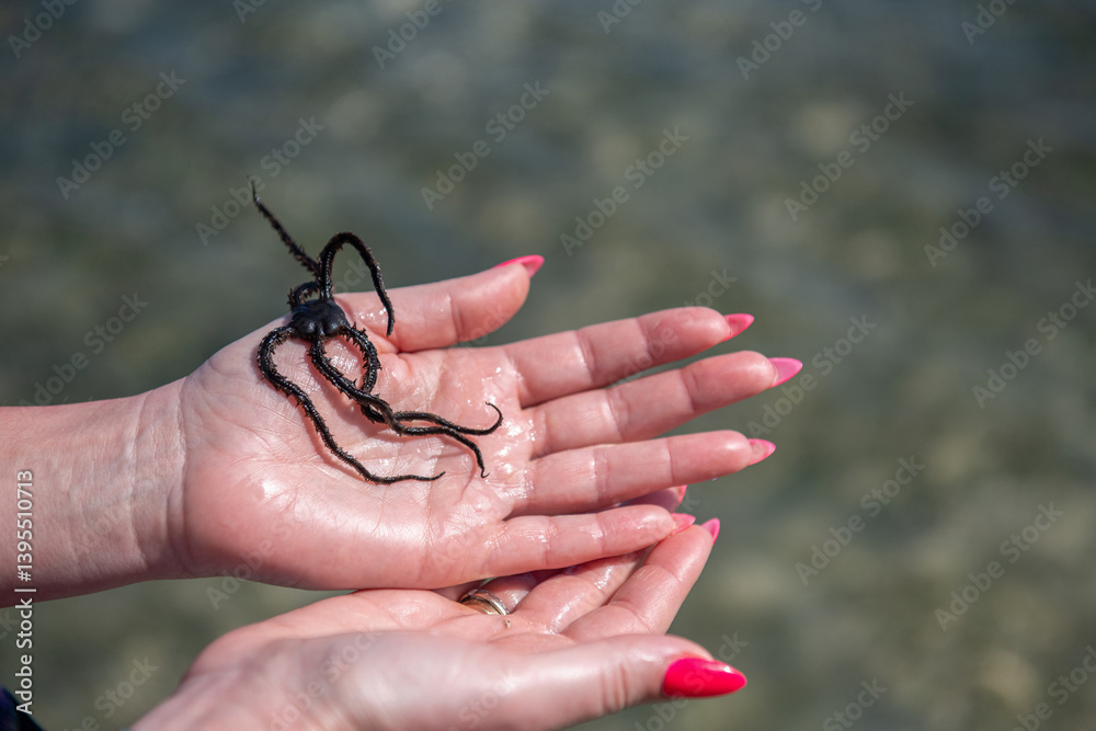 • Wężowidła - Brittle stars, denne zwierzęta morskie, o gwiaździstej budowie ciała podobnej do rozgwiazd. Osobnik na kobiecej dłoni, Ocean Indyjski, safari morskie, Kenia
