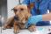 • The veterinarian doctor treating, checking on dog at vet clinic
