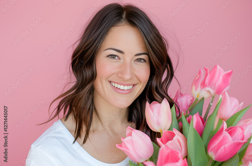 • Uśmiechnięta kobieta z bukietem różowych tulipanów na tle.