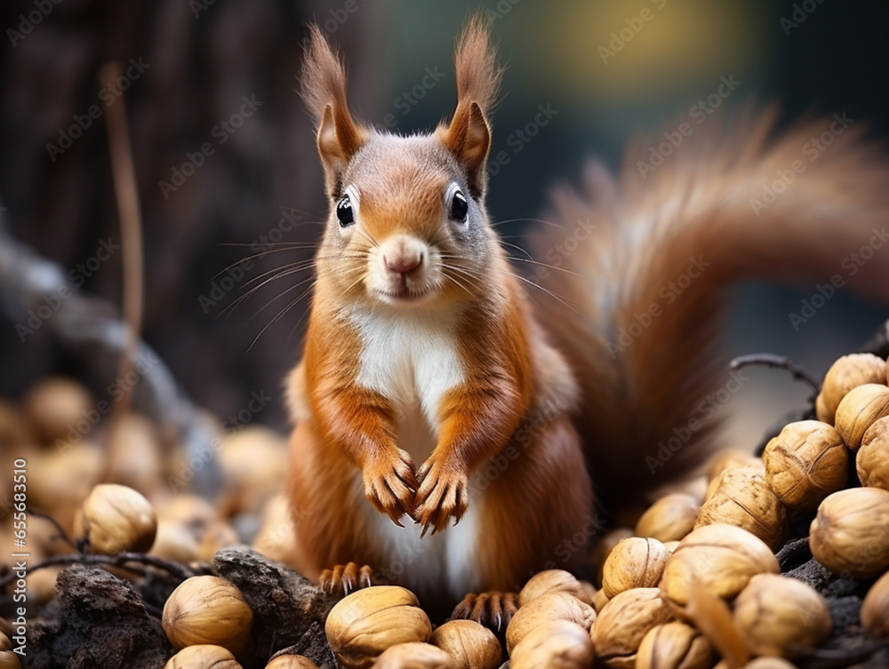 Zwierzęta - wiewiórka zbierająca orzechy w lesie. #655683510