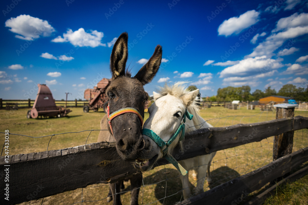 • Przyjaciele z Wioski - koń i osioł na tle Wiejskiego Krajobrazu