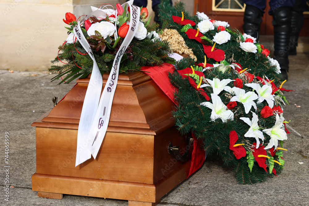 Kwiaty - Trumna na pogrzebie z leżącymi kwiatami na pożegnanie. #744065999
