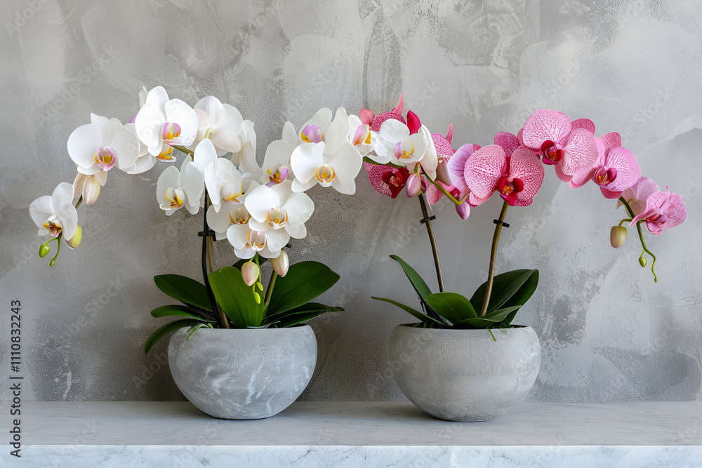 • Eleganckie storczyki w białych i różowych odcieniach, umieszczone w minimalistycznych, szarych donicach na tle jasnej ściany.