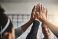 • Fitness, success and high five of people in gym for motivation, support and target. Workout, exercise and training with hands of friends in sports center for team building, challenge and achievement