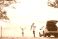 Obrazy Auto - Happy Family with car travel road trip. summer vacation in car in the sunset, Dad, mom and... #548534620