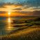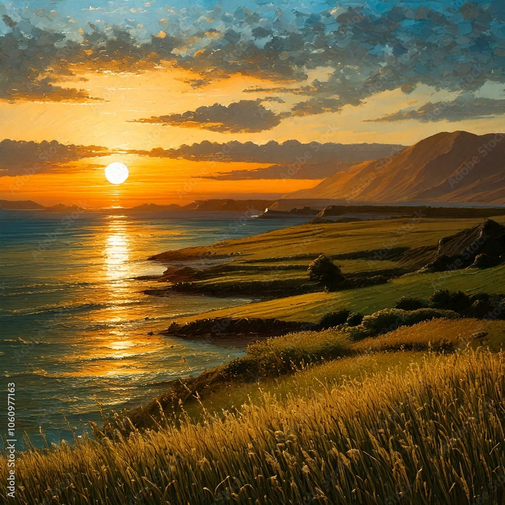 Obrazy Zachód słońca - Zachód słońca nad morzem. Morski krajobraz z zielonymi łąkami #1060977163