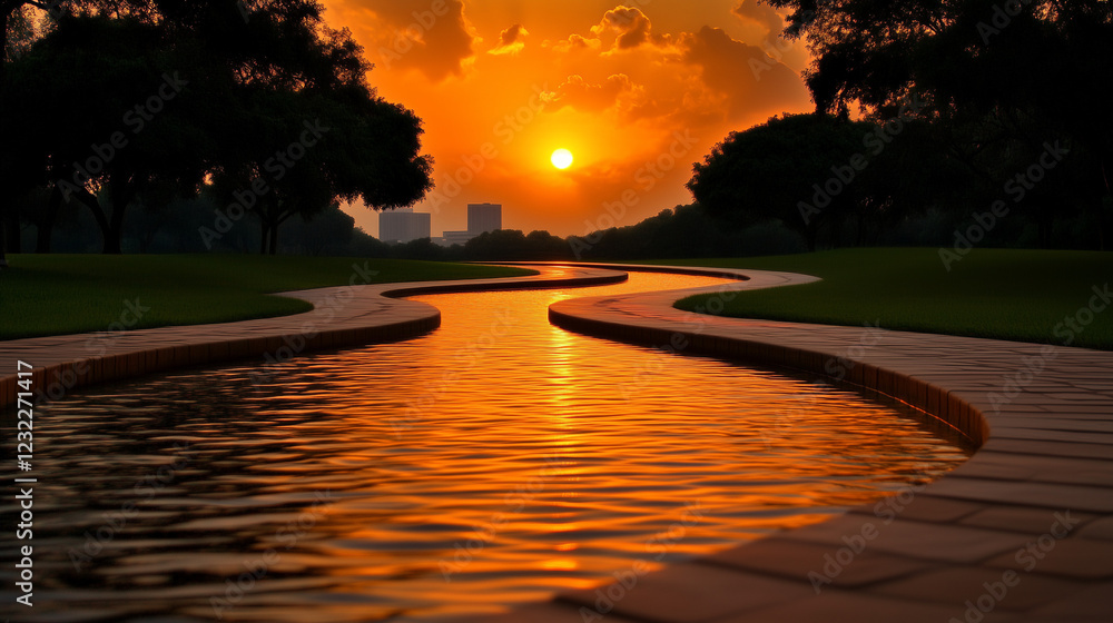 • Kręta wodna ścieżka w parku o zachodzie słońca