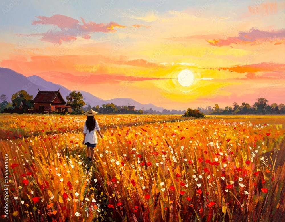 • Kobieta idąca przez łąkę. Zachód słońca, letni krajobraz.Obraz, sztuka, grafika