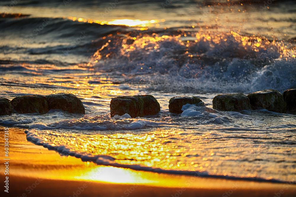 Obrazy Zachód słońca - Odbicie słońca w flacha morskiej wody wieczorem. #603047315