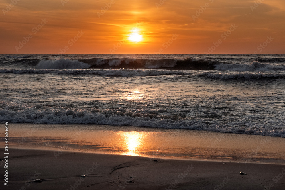 Obrazy Zachód słońca - przepiękny zachód słońca nad morzem, oceanem - z falochronami, falami #614455646