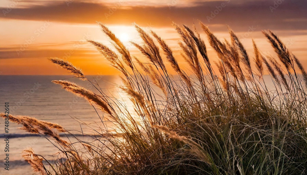 Obrazy Zachód słońca - Zachód słońca nad morzem , trawy. Tapeta, dekoracja. Generative AI #748842601