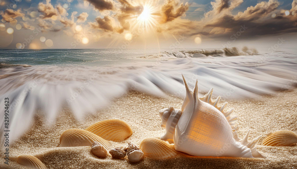 Obrazy Zachód słońca - Krajobraz morski, biała muszla makro, plaża zachód słońca #829924623