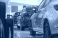 • Rear view of new luxury red and white car parked in modern show room. Selective focus on white shiny car. Car dealership concept. Showroom interior. Automotive industry on coronavirus crisis concept.