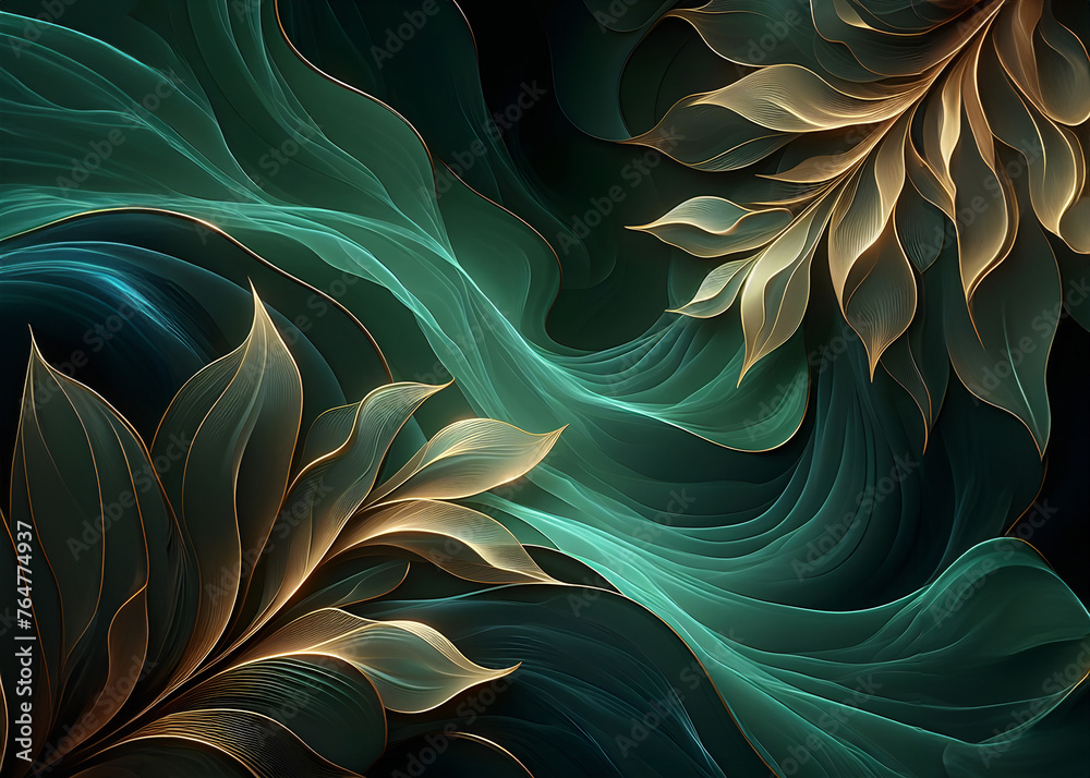 Fototapeta Trendy - Tapeta zielone liście, ze złotem, dekoracja generative ai #764774937