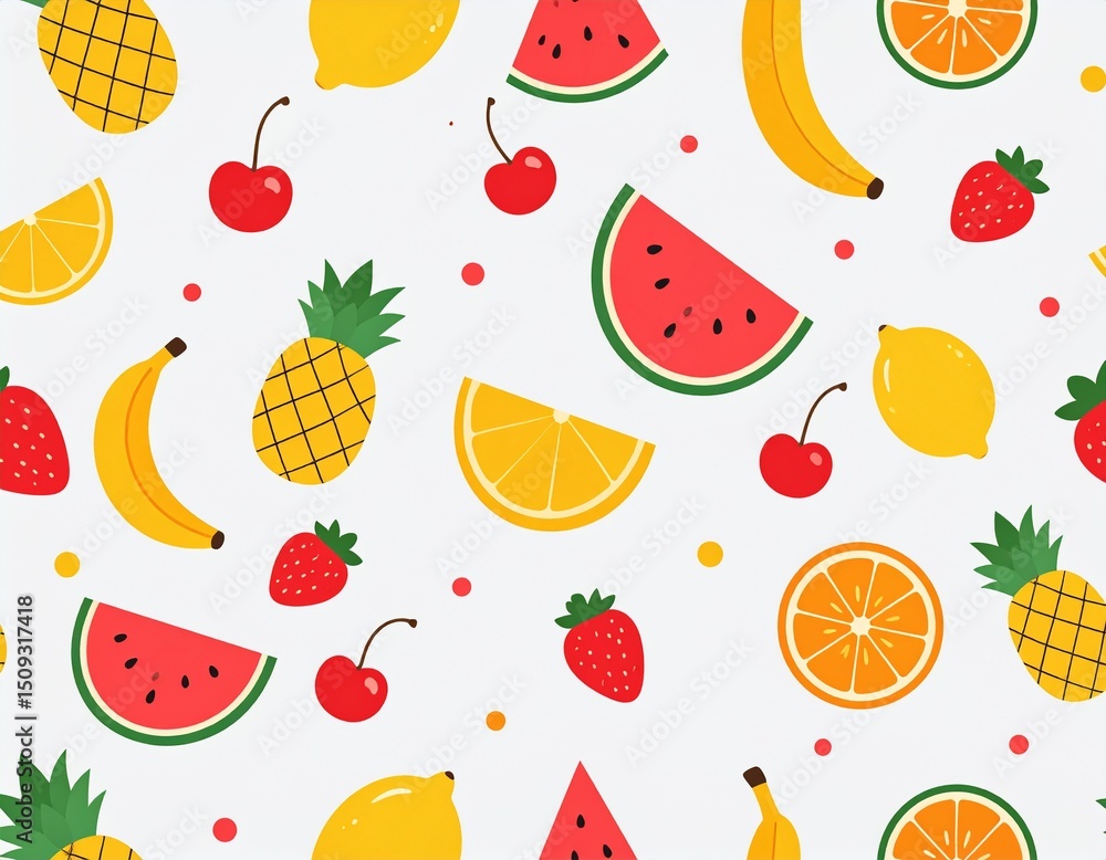 Fototapety Trendy - Letni wzór z owocami. Wiśnie, ananasy, truskawki, cytryny, pomarańcze, arbuzy i liście. Bezszwowy... #1509317418