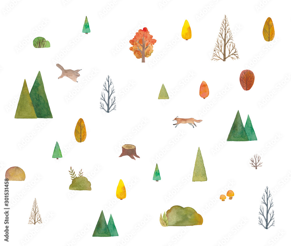 Obrazy Akwarela - 秋冬のいろいろな樹木の水彩イラスト。(ベクター) #301531458