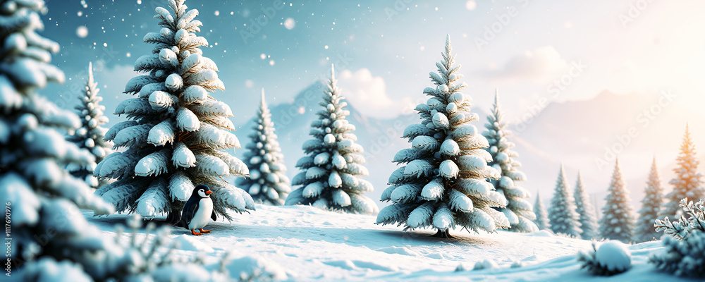 Obrazy Natura - paesaggio invernale innevato con abeti e pinguino #1117690976