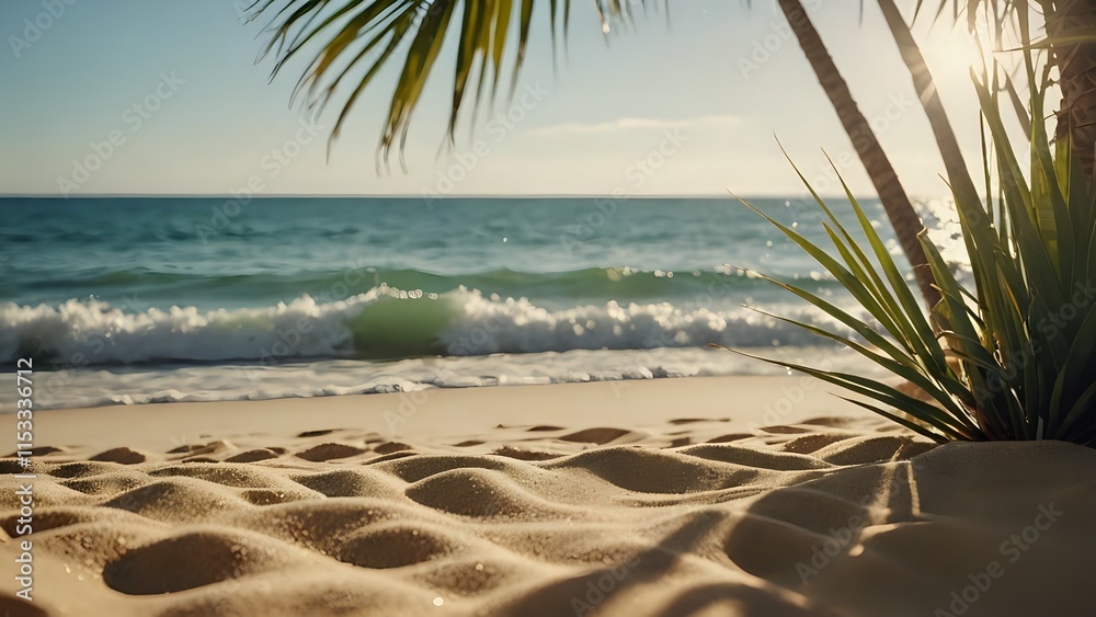 Obrazy Natura - Beach Holiday - Sand And Defocused Palm Leaves In Sunny Abstract Seascape With Glittering In Ocean #1153336712