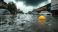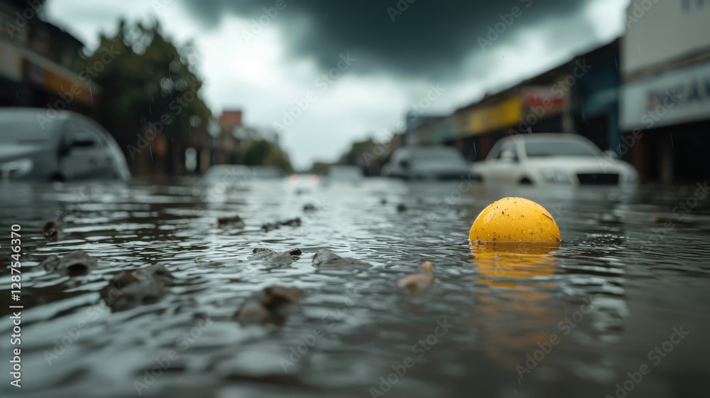 Obrazy Natura - Natural disasters design. Flooded street with a yellow ball floating in murky water. #1287546370