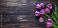 • Fioletowe tulipany na ciemnych drewnianych deskach – wiosenna kompozycja kwiatowa z miejscem na tekst