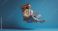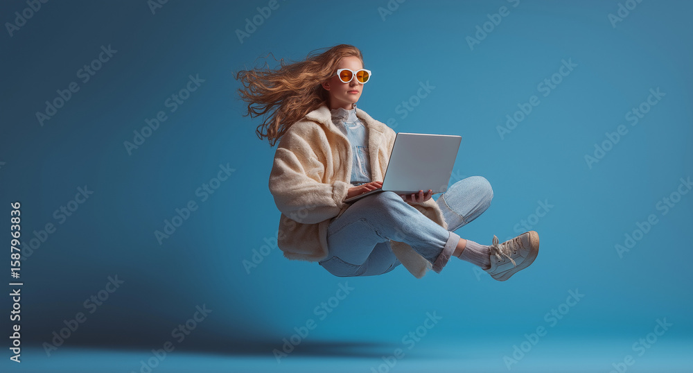 • A young woman is floating in the air, holding her laptop, portatile, business
