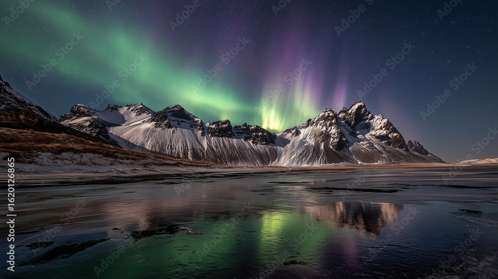 • Zorza polarna rozświetlająca nocne niebo nad górskim krajobrazem. Magiczna gra świateł natury wśród majestatycznych szczytów i zimowej scenerii.