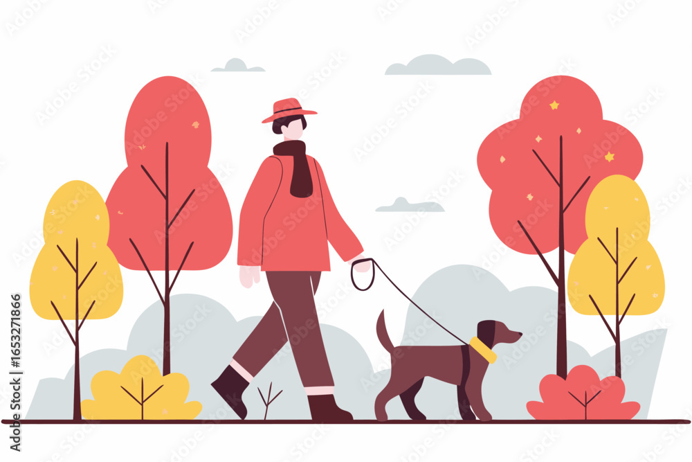 Obrazy Natura - Mężczyzna spacerujący z psem w jesiennym parku. Koncepcja relaksu, aktywnego stylu życia i... #1653271866