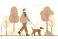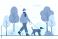 • Mężczyzna spacerujący z psem w jesiennym parku. Koncepcja relaksu, aktywnego stylu życia i spędzania czasu na łonie natury.