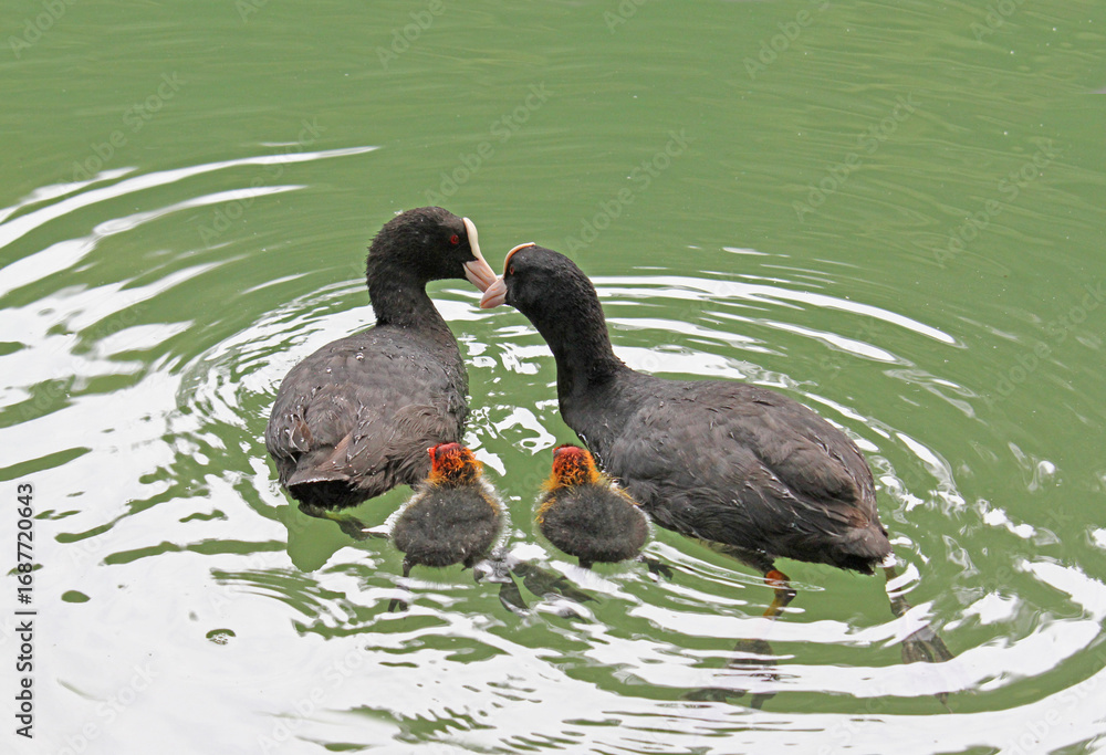 Obrazy Natura - tenera coppia di folaghe (Fulica atra) con due pulcini #1687720643