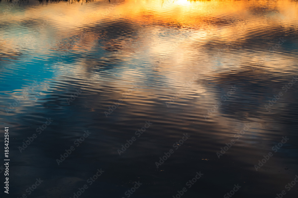 Obrazy Natura - bellissimo riflesso del cielo azzurro ed arancione e nuvoloso, al tramonto, su uno specchio... #1854225141