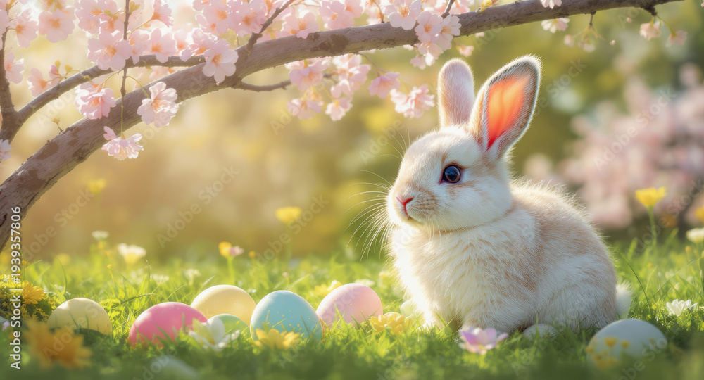 Obrazy Natura - Coniglietto bianco tra uova pasquali colorate. Generative AI #1939357806