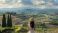 • Giovane bella donna con cappello vista da dietro immersa nelle colline toscane