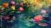 • Obraz przedstawia wodne lilie rosnące w stawie. Kolorowe kwiaty otaczają spokojną tafle wody, tworząc harmonijną kompozycję