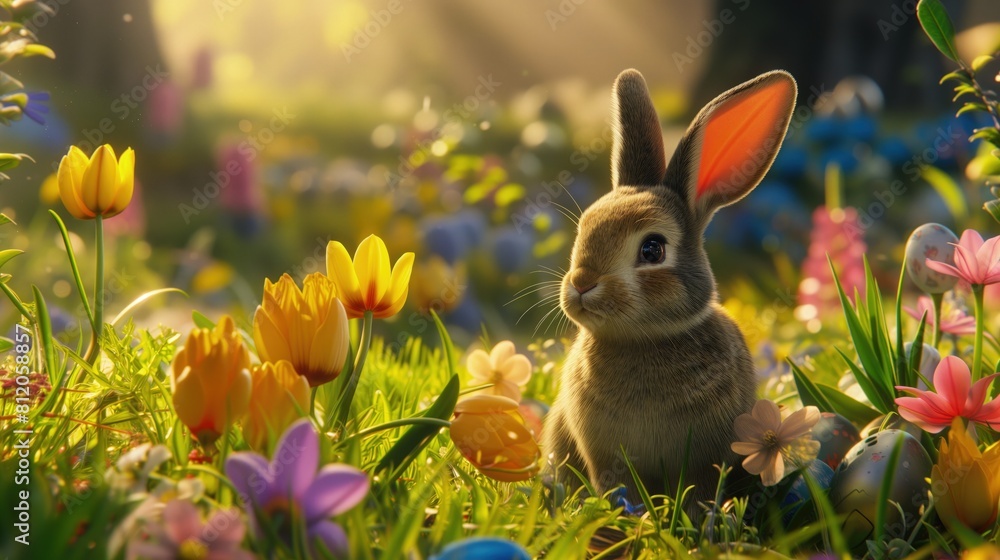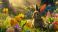 • Królik siedzi spokojnie w polu kwiatów, otoczony różnokolorowymi kwiatami. Światło słońca delikatnie oświetla scenę, tworząc uroczy obrazek natury