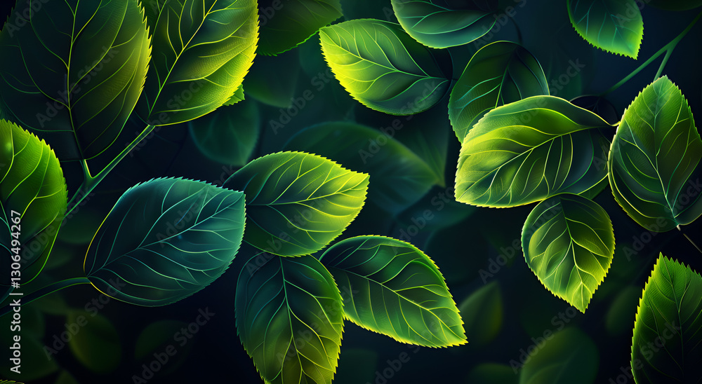 • Zielone liście w świetle na ciemnym tle, dekoracyjna ilustracja roślinna z efektem blasku i głębi