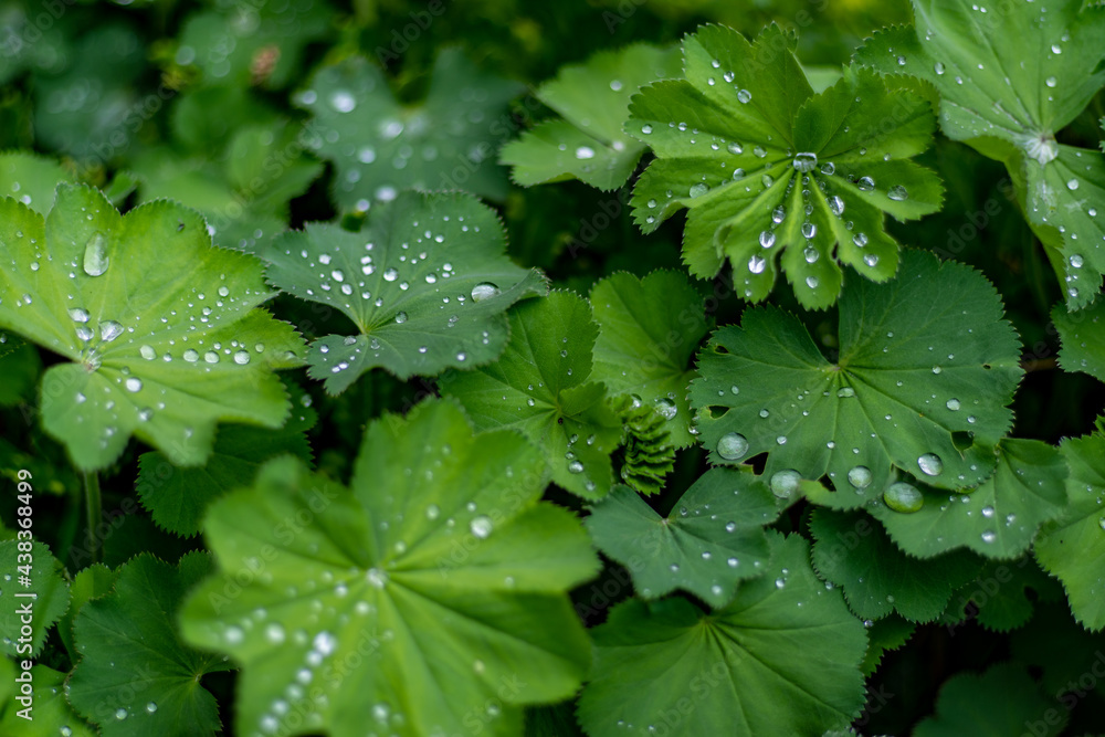 Obrazy Liście - ozdobne zielone liście z kroplami wody po deszczu #438368499