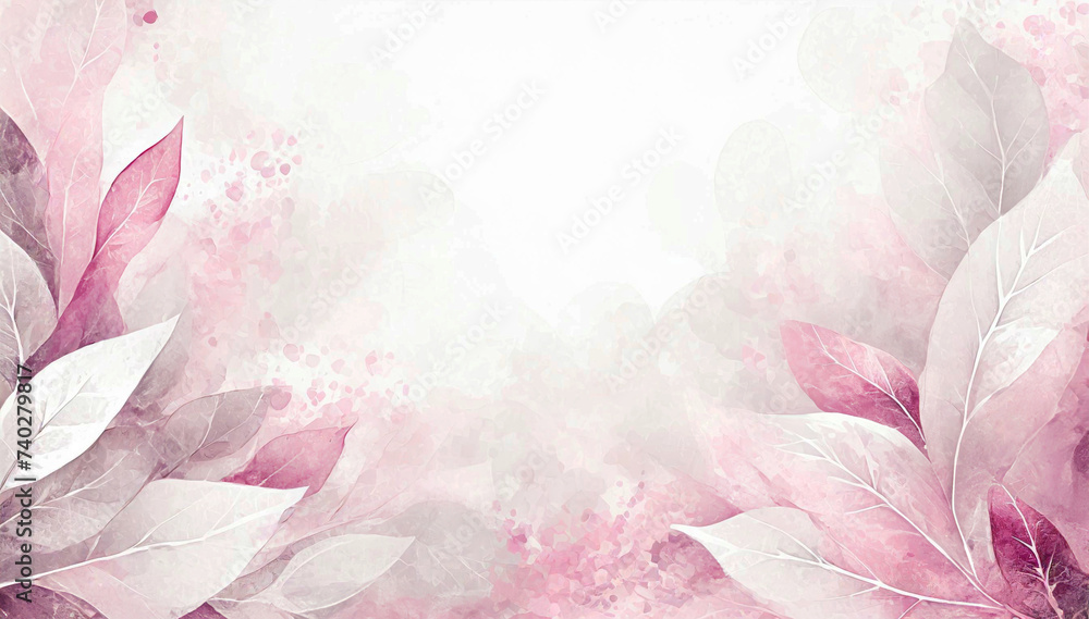 Obrazy Liście - Pastelowe tło, różowe liście. Abstrakcyjna tapeta akwarela. Puste miejsce #740279817