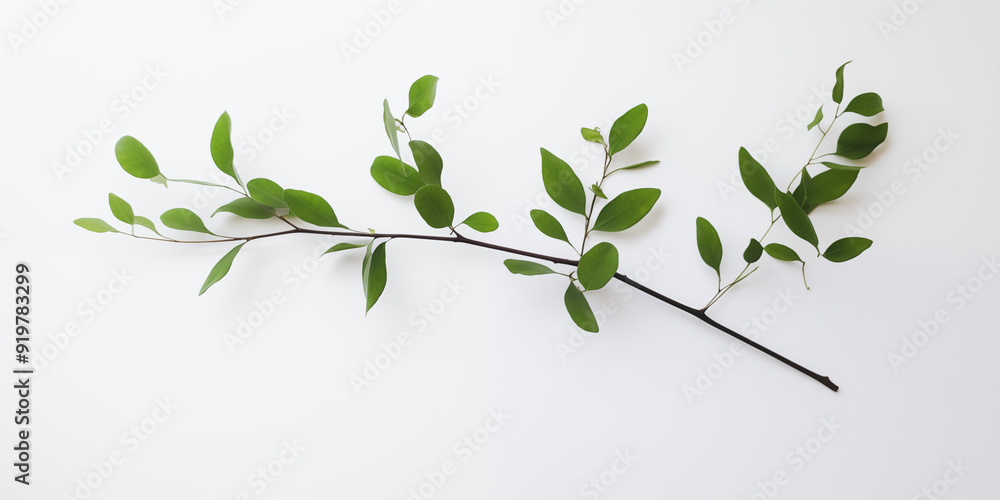 Obrazy Liście - Białe gładkie tło pod baner, grafikę z napisami. Zielone rośliny, gałązki i liście kwiatów. Widok... #919783299