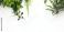 • Białe gładkie tło pod baner, grafikę z napisami. Zielone rośliny, gałązki i liście kwiatów. Widok z góry